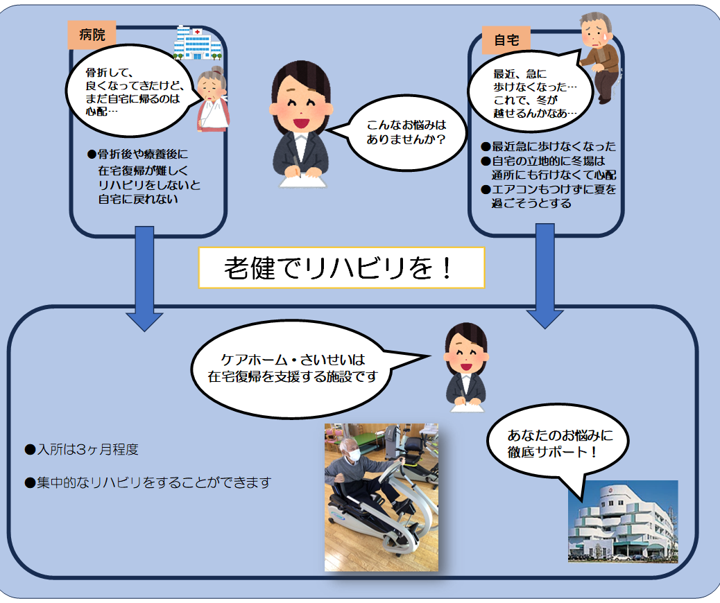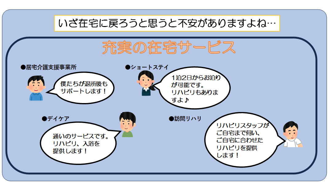 一定期間、日常生活の介護及びリハビリを行い、在宅復帰の支援を致します。